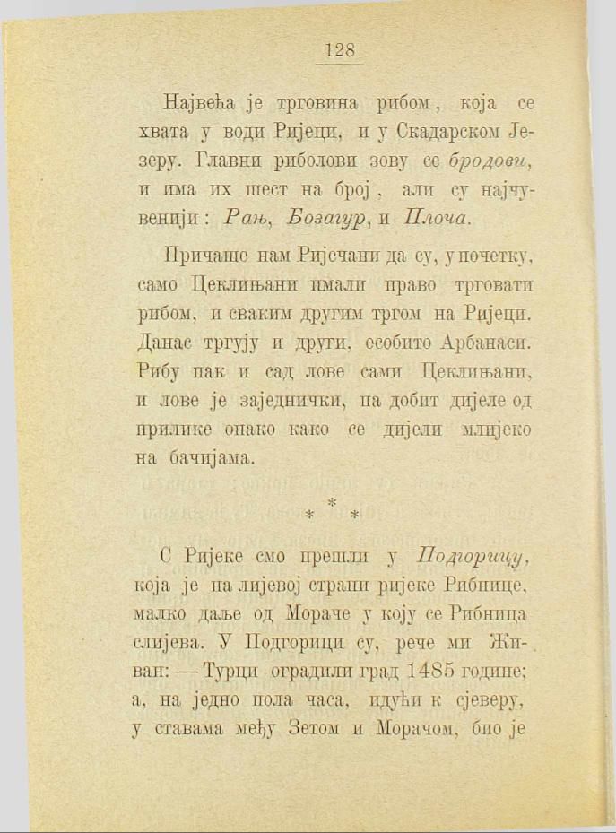 С Ријеке смо прешли у Подгорицу, која је на лијевој страни ријеке Рибнице, малко даље од Мораче у коју се Рибница слијева. У Подгорици су, рече ми Живан: — Турци оградили град 1485 године; а, на једно пола часа, идући к сјеверу, у ставама међу Зетом и Морачом, био је