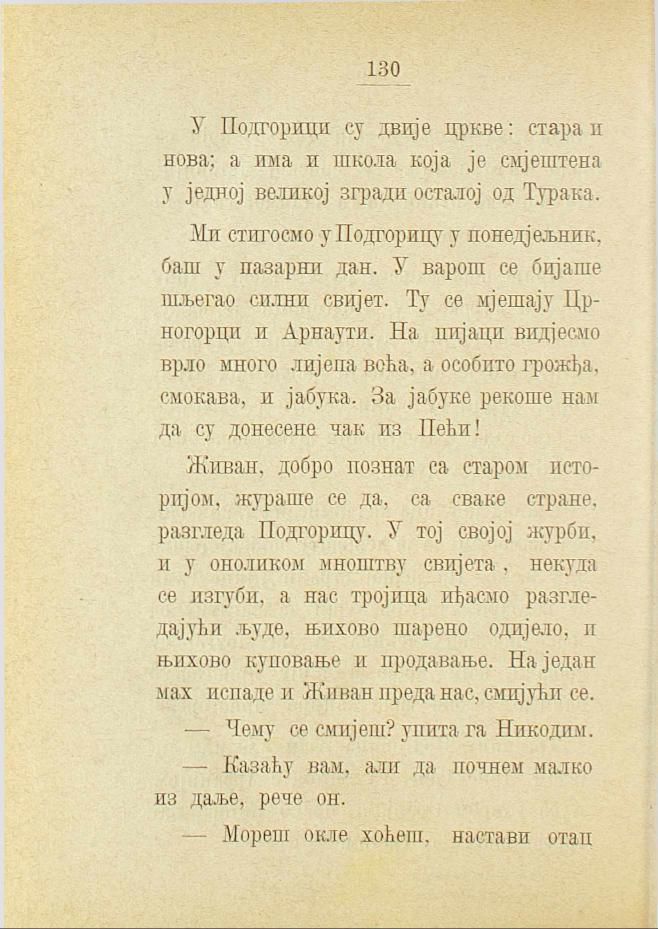 Ми стигосмо у Подгорицу у понедјељник, баш у пазарни дан. У варош се бијаше шљегао силни свијет. Ту се мјешају Црногорци и Арнаути. На пијаци видјесмо врло много лијепа воћа, а особито грожђа, смокава, и јабука. За јабуке рекоше нам да су донесене чак из Пећи!