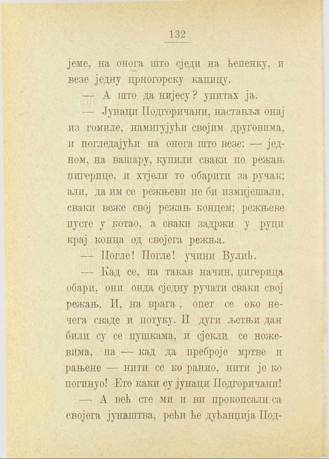 — Кад се, на такав начин, џигерица обари, они онда сједну ручати сваки свој режањ. И, на врага, опет се око нечега сваде и потуку. И дуги љетњи дан били су се пушкама, и сјекли се ножевима, па — кад да преброје мртве и рањене — нити се ко ранио, нити је ко погинуо! Ето каки су јунаци Подгоричани!