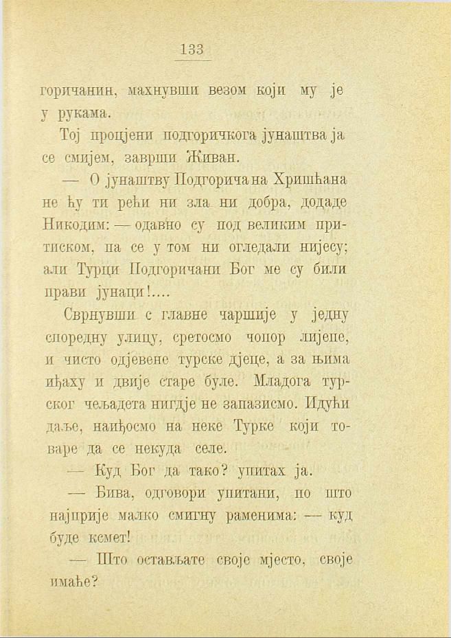 — О јунаштву Подгоричана Хришћана не ћу ти рећи ни зла ни добра, додаде Никодим: — одавно су под великим притиском, па се у том ни огледали нијесу; али Турци Подгоричани Бог ме су били прави јунаци!....