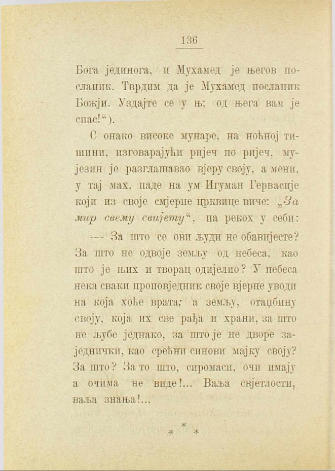 С онако високе мунаре, на ноћној тишини, изговарајући ријеч по ријеч, мујезин је разглашавао вјеру своју, а мени, у тај мах, паде на ум Игуман Гервасије који из своје смјерне црквице виче: „За мир свему свијету", па рекох у себи: