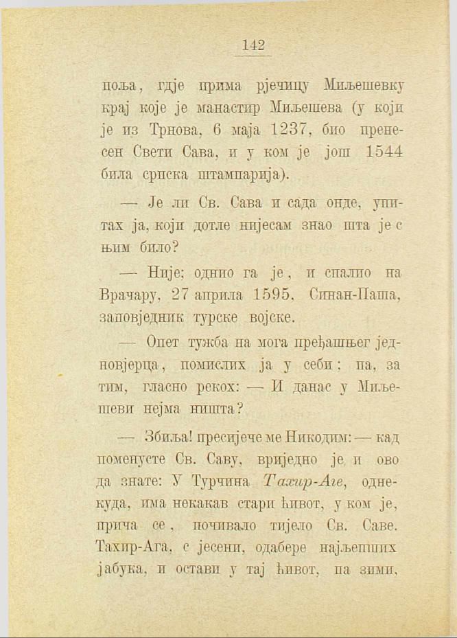 — Збиља! пресијече ме Никодим: — кад поменусте Св. Саву, вриједно је, и ово да знате: У Турчина Тахир-Аге, однекуда, има некакав стари ћивот, у ком је, прича се, почивало тијело Св. Саве. Тахир-Ага, с јесени, одабере најљепших јабука, и остави у тај ћивот, па зими,