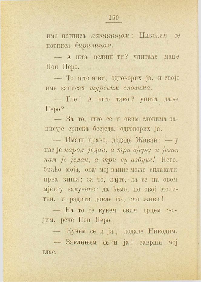 — Имаш право, додаде Живан: — У нас је народ један, а три вјере; и језик нам је један, а три су азбуке! Него, браћо моја, овај мој запис може сплакати прва киша; за то, дајте, да се на овом мјесту закунемо: да ћемо, по овој молитви, и радити докле год смо живи!
