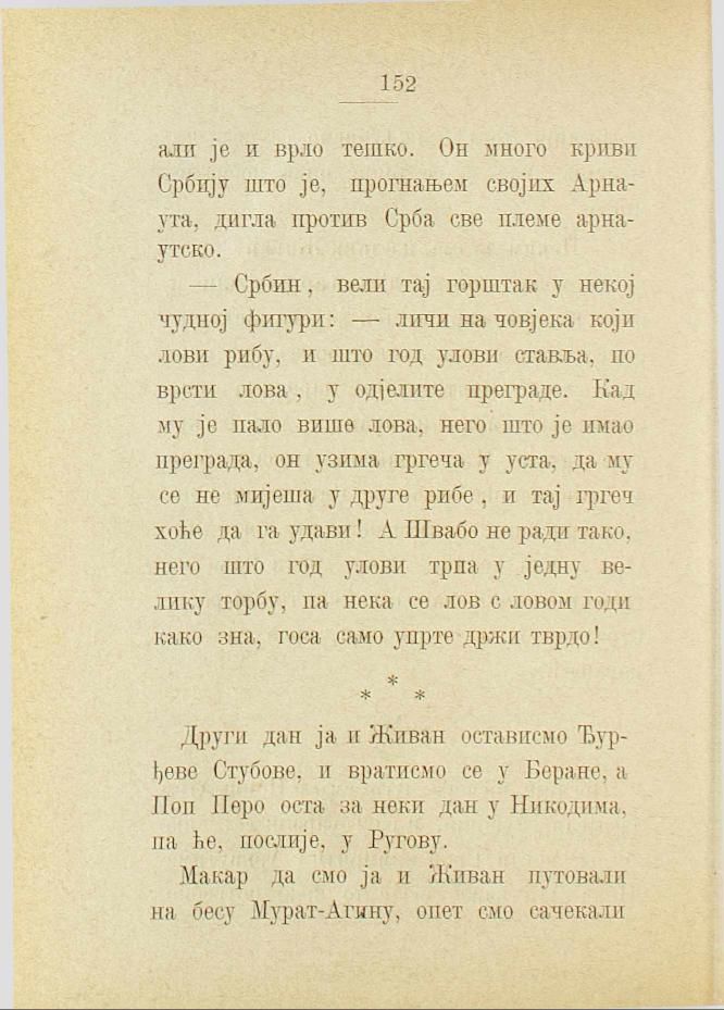 — Србин, вели тај горштак у некој чудној фигури: — личи на човјека који лови рибу, и што год улови ставља, по врсти лова, у одјелите преграде. Кад му је пало више лова, него што је имао преграда, он узима гргеча у уста, да му се не мијеша у друге рибе, и тај гргеч хоће да га удави! А Швабо не ради тако, него што год улови трпа у једну велику торбу, па нека се лов с ловом годи како зна, госа само упрте држи тврдо!