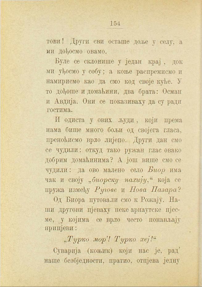 И одиста у ових људи, који према нама бише много бољи од својега гласа, преноћисмо врло лијепо. Други дан смо се чудили: откуд тако ружан глас овако добрим домаћинима? А још више смо се чудили: да ово малено село Биор има чак и своју „биорску нахију,“ која се пружа између Ругове и Нова Пазара?