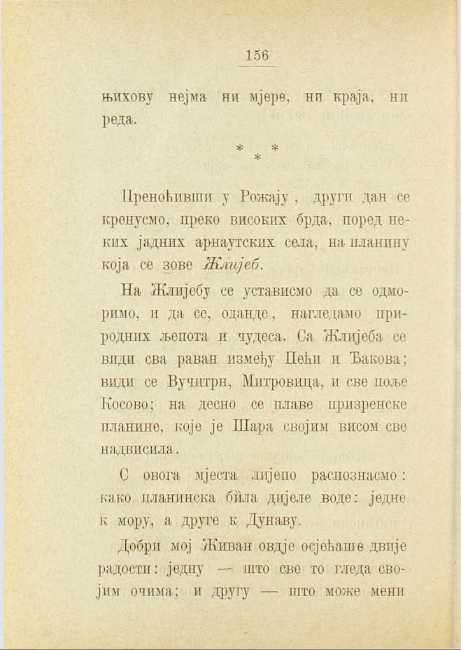 На Жлијебу се устависмо да се одморимо, и да се, оданде, нагледамо природних љепота и чудеса. Са Жлијеба се види сва раван између Пећи и Ђакова; види се Вучитрн, Митровица, и све поље Косово; на десно се плаве призренске планине, које је Шара својим висом све надвисила.