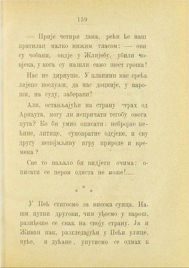 У Пећ стигосмо за висока сунца. Наши путни другови, чим уђосмо у варош, разиђоше се свак на своју страну. Ја и Живан пак, разгледајући у Пећи улице, куће, и дућане, упутисмо се одмах к
