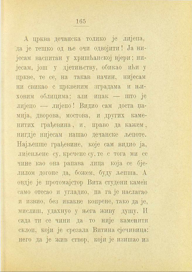 А црква дечанска толико је лијепа, да је тешко од ње очи одвојити! Ја нијесам васпитан у хришћанској вјери; нијесам, још у дјетињству, обикао ићи у цркве, те се, на такав начин, нијесам ни свикао с црквеним зградама и њиховим облицима; али ипак — што је лијепо — лијепо! Видио сам доста џамија, дворова, мостова, и других каменитих грађевина, и, право да кажем, нигдје нијесам нашао дечанске љепоте. Најљепше грађевине, које сам видио ја, лијепљене су, кремене су, те с тога ми се чине као она рапава лица која се бјелилом догоне да, божем, буду љепша. А овдје је протомајстор Вита студени камен само отесао и угладио, па га је наслагао и извио, без икакве копрене, тако да је, мислиш, удахнуо у њега живу душу. И сада ти се чини да то није каменити склоп, који је срезала Витина сјечивица: него да је жив створ, који је изишао из уста