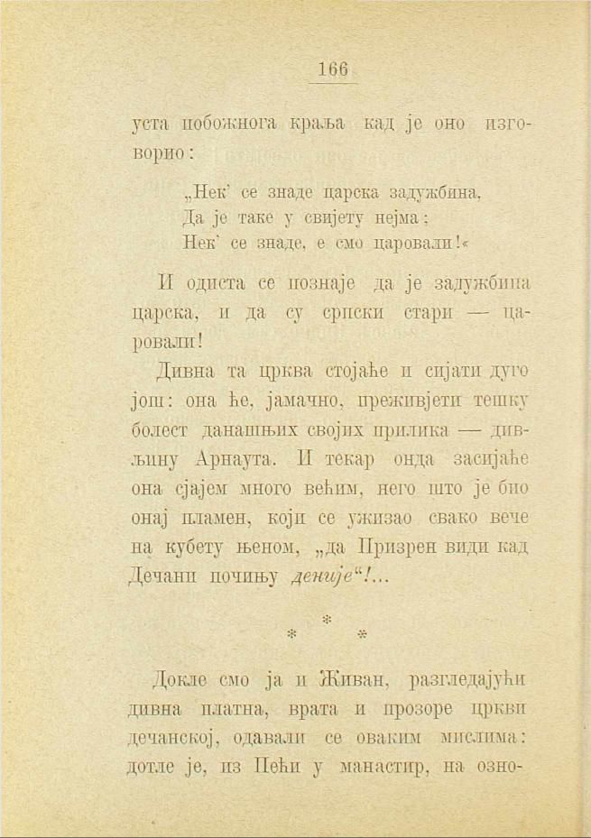 Докле смо ја и Живан, разгледајући дивна платна, врата и прозоре цркви дечанској, одавали се оваким мислима: дотле је, из Пећи у манастир, на ознојену