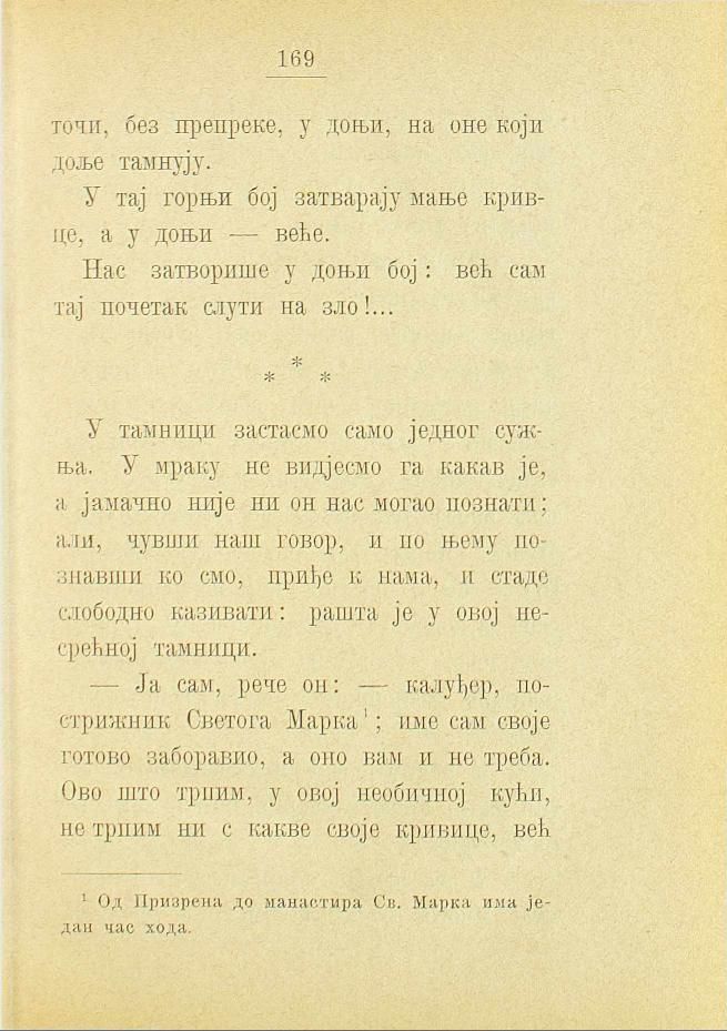 У тамници застасмо само једног сужња. У мраку не видјесмо га какав је, а јамачно није ни он нас могао познати; али, чувши наш говор, и по њему познавши ко смо, приђе к нама, и стаде слободно казивати: рашта је у овој несрећној тамници.