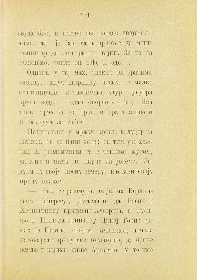 — Како се рашчуло, да је, на Берлинском Конгресу, углављено да Босну и Херцеговину притисне Аустрија, а Гусиње и Плав да припадну Црној Гори: одмах је Порта, својим начинима, почела наговарати арнаутске поглавице, да бране земље у којима живе Арнаути. У то име