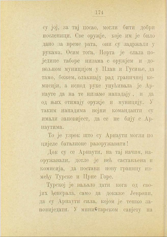 су јој, за тај посао, могли бити добри посленици. Све оружје, које им је било дано за време рата, они су задржали у рукама. Осим тога, Порта је слала поједине таборе низама с оружјем и довољном муницијом у Плав и Гусиње, да тамо, божем, олакшају рад граничној комисији, а испод руке упућивала је Арнауте да на те низаме нападају, и да од њих отимају оружје и муницију. У таким нападима војни команданти су имали заповијест, да се не бију с Арнаутима.