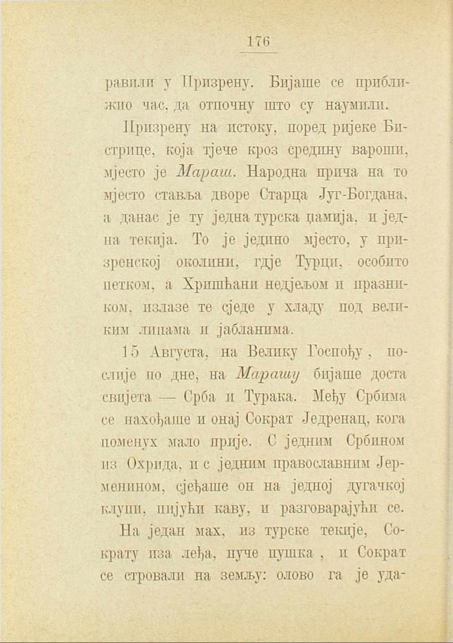 15 Августа, на Велику Госпођу, послије по дне, на Марашу бијаше доста свијета — Срба и Турака. Међу Србима се нахођаше и онај Сократ Једренац, кога поменух мало прије. С једним Србином из Охрида, и с једним православним Јерменином, сјеђаше он на једној дугачкој клупи, пијући каву, и разговарајући се.