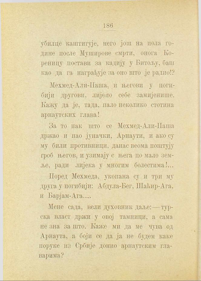 Мене сада, вели духовник даље: — турска власт држи у овој тамници, а сама не зна за што. Каже ми да ме чува од Арнаута, а боји се да ја не будем каке поруке из Србије донио арнаутским главарима?