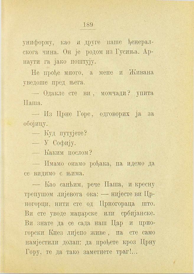 — Као санћим, рече Паша, и кресну трепушом лијевога ока: — нијесте ви Црногорци, нити сте од Црногораца што. Ви сте уводе маџарске или србијанске. Ви знате да се сада наш Цар и црногорски Кнез лијепо живе, па сте само намјестили долап: да прођете кроз Црну Гору, те да тако заметнете траг!...