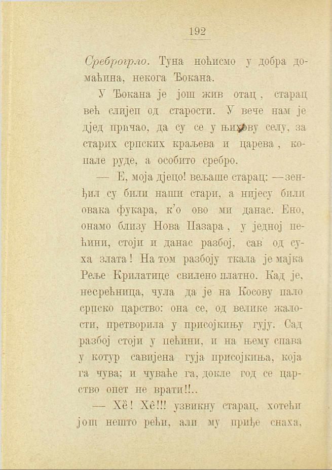 — Е, моја дјецо! вељаше старац: — зенђил су били наши стари, а нијесу били овака фукара, к’о ово ми данас. Ено, онамо близу Нова Пазара, у једној пећини, стоји и данас разбој, сав од суха злата! На том разбоју ткала је мајка Реље Крилатице свилено платно. Кад је, несрећница, чула да је на Косову пало српско царство: она се, од велике жалости, претворила у присојкињу гују. Сад разбој стоји у пећини, и на њему спава у котур савијена гуја присојкиња, која га чува: и чуваће га, докле год се царство опет не врати!!..