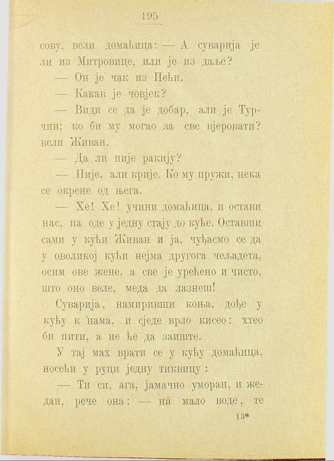 — Хе! Хе! учини домаћица, и остави нас, па оде у једну стају до куће. Оставши сами у кући Живан и ја, чуђасмо се да у оволикој кући нејма другога чељадета, осим ове жене, а све је уређено и чисто, што оно веле, меда да лазнеш!