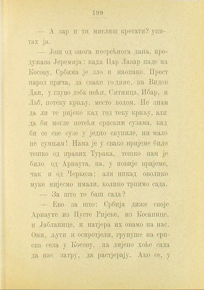 — Још од онога несрећнога дана; продужава Јеремија: када Цар Лазар паде на Косову, Србима је зло и наопако. Прост народ прича, да сваке године, на Видов Дан, у глуво доба ноћи, Ситница, Ибар, и Лаб, потеку крвљу, место водом. Не знам да ли те ријеке кад год теку крвљу, али да би могле потећи српским сузама, кад би се све сузе у једно скупиле, ни мало не сумњам! Нама је у свако вријеме било тешко од правих Турака, тешко нам је било од Арнаута, па, у новије вријеме, чак и од Черкеза; али никад оволико муке нијесмо имали, колико трпимо сада.