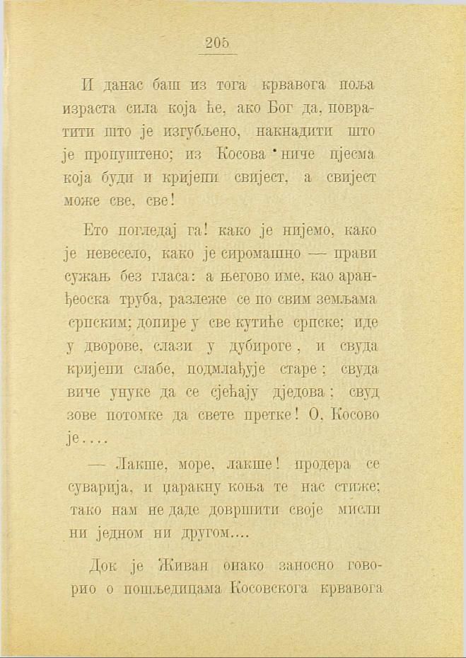Ето погледај га! како је нијемо, како је невесело, како је сиромашно — прави сужањ без гласа: а његово име, као аранђеоска труба, разлеже се по свим земљама српским; допире у све кутиће српске; иде у дворове, слази у дубироге, и свуда кријепи слабе, подмлађује старе; свуда виче унуке да се сјећају дједова: свуд зове потомке да свете претке! О, Косово је...