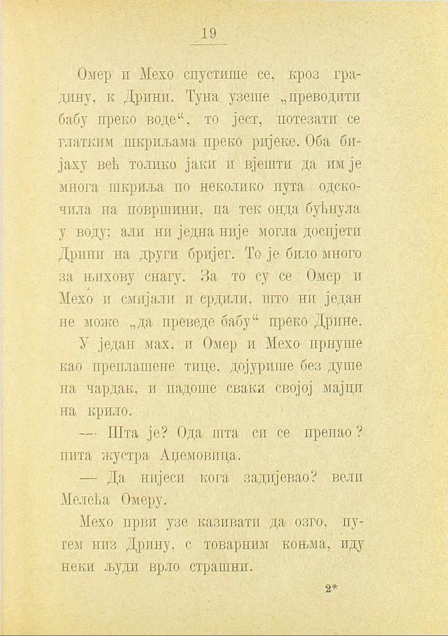 Омер и Мехо спустише се, кроз градину, к Дрини. Туна узеше „преводити бабу преко воде“, то јест, потезати се глатким шкрињама преко ријеке. Оба бијаху већ толико јаки и вјешти да им је многа шкриља по неколико пута одскочила на површини, па тек онда бућнула у воду; али ни једна није могла доспјети Дрини на други бријег. То је било много за њихову снагу. На то су се Омер и Мехо и смијали и срдили, што ни један не може „да преведе бабу“ преко Дрине.