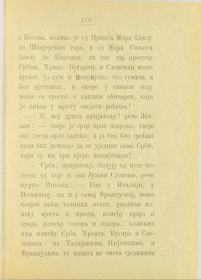 — Срби, пријатељу, болују од исте болести од које и сви Јужни Словени, рече журно Никола: — Ено у Италији, у Њемачкој, па и у самој Француској, може човјек наћи толиких истих разлика између мјеста и мјеста, између краја и краја, између говора и говора, коликих има између Срба, Хрвата, Бугара и Словенаца: па Талијанима, Нијемцима, и Французима то ништа не смета сјединити