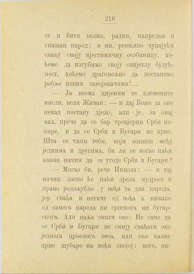 — Ја веома цијеним те племените мисли, вели Живан: — и дај Боже да оне некад постану дјело, али је, за овај мах, прече да се бар тровјерни Срби измире, и да се Срби и Бугари не крве. Шта се чини теби, који живиш међу једнима и другима, би ли се могао наћи какав начин да се угоде Срби и Бугари?