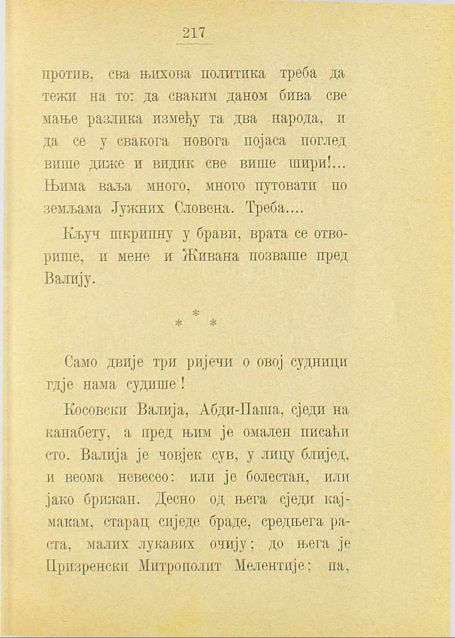 Косовски Валија, Абди-Паша, сједи на канабету, а пред њим је омален писаћи сто. Валија је човјек сув, у лицу блијед, и веома невесео: или је болестан, или јако брижан. Десно од њега сједи кајмакам, старац сиједе браде, средњега раста, малих лукавих очију; до њега је Призренски Митрополит Мелентије; па,
