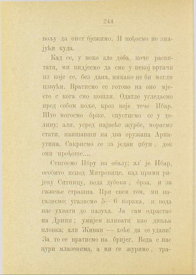 Стигосмо Ибру на обалу: ал’ је Ибар, особито испод Митровице, кад прими ријеку Ситницу, вода дубока, брза, и за гажење страшна. При свем том, ми нагазисмо; угазисмо 5-6 корака, и вода нас ухвати до пазуха. Ја сам одрастао на Дрини; умијем пливати као дивља пловка: али Живан — хоће да се удави! За то се вратисмо на бријег. Вода с нас цури млазевима, а ми се журимо, тражећи