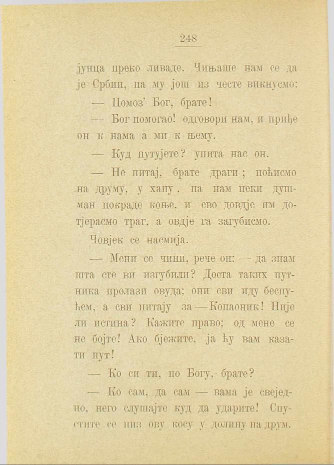 — Мени се чини, рече он: — да знам шта сте ви изгубили? Доста таких путника пролази овуда; они сви иду беспућем, а сви питају за — Копаоник! Није ли истина? Кажите право; од мене се не бојте! Ако бјежите, ја ћу вам казати пут!