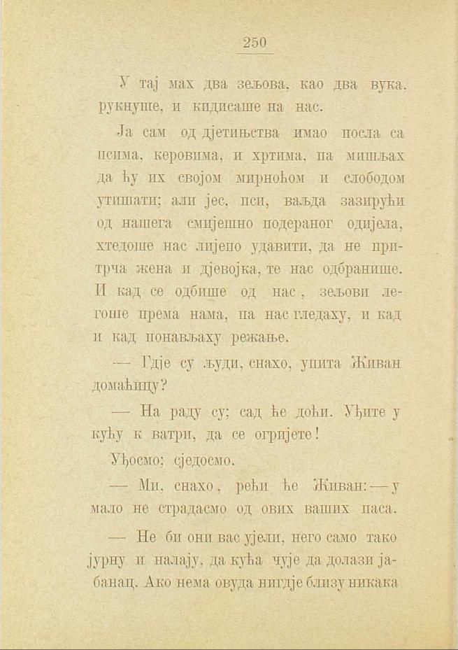 Ја сам од дјетињства имао посла са псима, керовима, и хртима, па мишљах да ћу их својом мирноћом и слободом утишати; али јес, пси, ваљда зазирући од нашега смијешно подераног одијела, хтедоше нас лијепо удавити, да не притрча жена и дјевојка, те нас одбранише. И кад се одбише од нас, зељови легоше према нама, па нас гледаху, и кад и кад понављаху режање.
