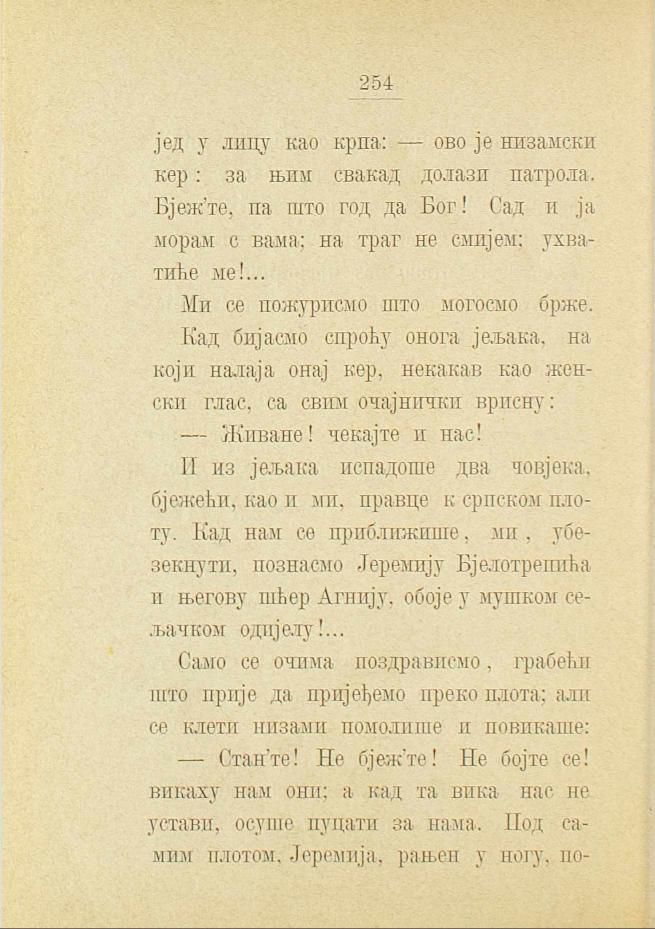 И из јељака испадоше два човјека, бјежећи, као и ми, правце к српском плоту. Кад нам се приближише, ми, убезекнути, познасмо Јеремију Бјелотрепића и његову шћер Агнију, обоје у мушком сељачком одијелу!...