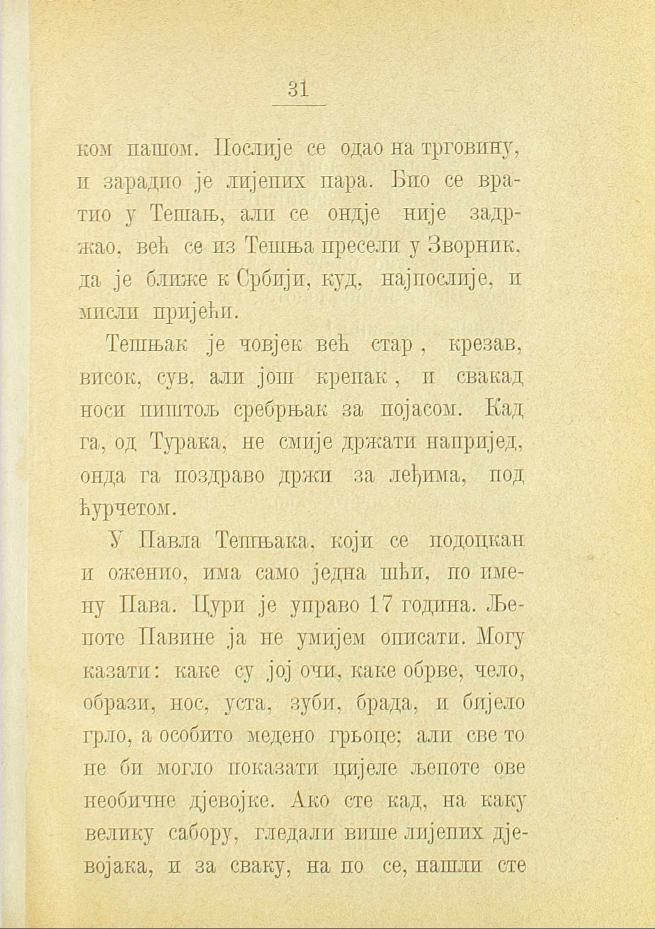 У Павла Тешњака, који се подоцкан и оженио, има само једна шћи, по имену Пава. Цури је управо 17 година. Љепоте Павине ја не умијем описати. Могу казати: каке су јој очи, каке обрве, чело, образи, нос, уста, зуби, брада, и бијело грло, а особито медено грьоце; али све то не би могло показати цијеле љепоте ове необичне дјевојке. Ако сте кад, на каку велику сабору, гледали више лијепих дјевојака, и за сваку, на по се, нашли сте