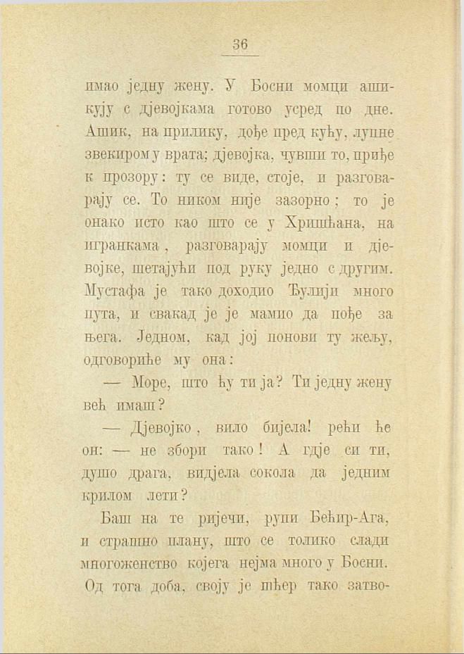 имао једну жену. У Босни момци ашикују с дјевојкама готово усред по дне. Ашик, на прилику, дође пред кућу, лупне звекиром у врата; дјевојка, чувши то, приђе к прозору: ту се виде, стоје, и разговарају се. То ником није зазорно; то је онако исто као што се у Хришћана, на игранкама, разговарају момци и дјевојке, шетајући под руку једно с другим. Мустафа је тако доходио Ђулији много пута, и свакад је је мамио да пође за њега. Једном, кад јој понови ту жељу, одговориће му она: