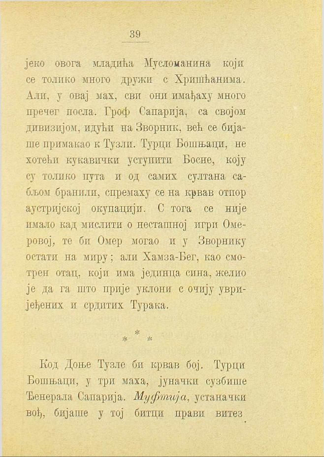 овога младића Мусломанина који се толико много дружи с Хришћанима. Али, у овај мах, сви они имађаху много пречег посла. Гроф Самарија, са својом дивизијом, идући на Зворник, већ се бијаше примакао к Тузли. Турци Бошњаци, не хотећи кукавички уступити Босне, коју су толико пута и од самих султана сабљом бранили, спремаху се на крвав отпор аустријској окупацији. С тога се није имало кад мислити о несташној игри Омеровој, те би Омер могао и у Зворнику остати на миру; али Хамза-Бег, као смотрен отац, који има јединца сина, желио је да га што прије уклони с очију увријеђених и срдитих Турака.