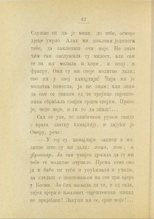 — У тој су хамајлији записи и молитве што су ми дали: хоџа, поп, и фратар. Ја сам увијек држала да су ми тебе те молитве очувале. Према томе смо ја и бабо ти тебе и упућивали и учили, да гледаш с поштовањем на све три вјере у Босни. Ја бих жељела да ти, и од сада, тијех вјера и њихових свјештеника никад не вријеђаш! Закуни ми се, срце моје!...