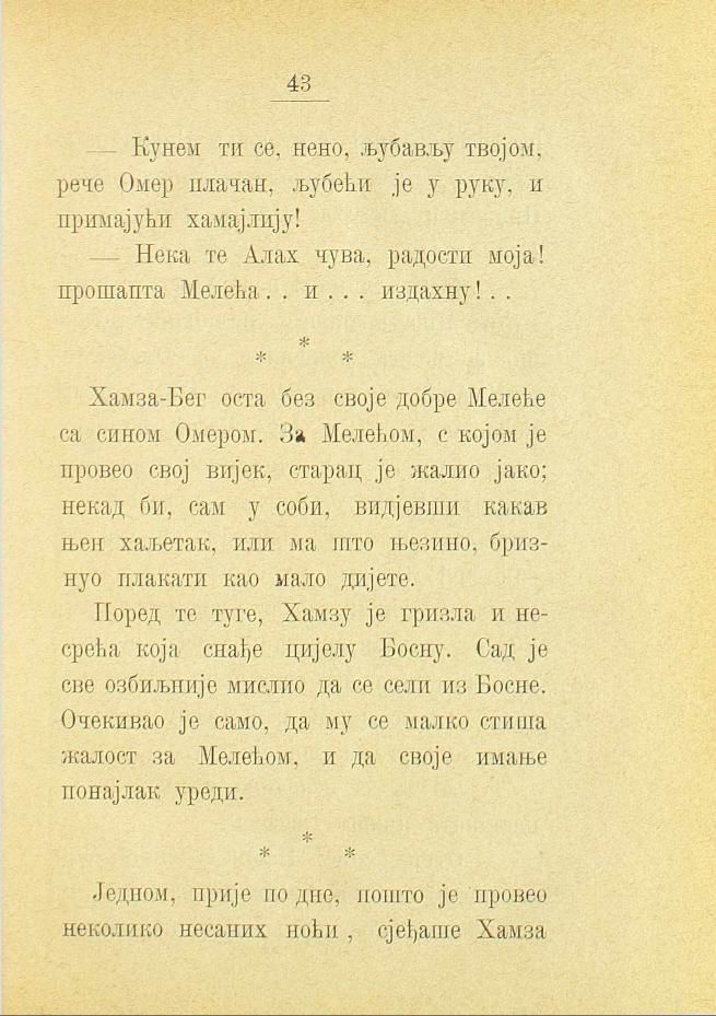 Хамза-Бег оста без своје добре Мелеће са сином Омером. За Мелећом, с којом је провео свој вијек, старац је жалио јако; некад би, сам у соби, видјевши какав њен хаљетак, или ма што њезино, бризнуо плакати као мало дијете.