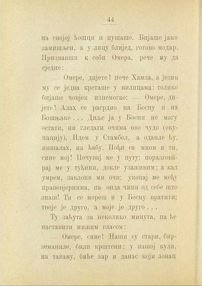 — Омере, дијете! поче Хамза, а језик му се једва креташе у вилицама: толико бијаше човјек изнемогао: — Омере, дијете! Алах се расрдио на Босну и на Бошњаке. . . Диље ја у Босни не могу остати, ни гледати очима ово чудо (окупацију). Идем у Стамбол, а оданле ћу, иншалах, на ћабу. Пођи са мном и ти, сине мој! Почувај ме у путу: поразговарај ме у туђини, докле узаживим; а кад умрем, заклопи ми очи: укопај ме међу правовјернима, па онда чини од себе што знаш! Ти се мореш и у Босну вратити; твоје је друго, а моје је друго. . .