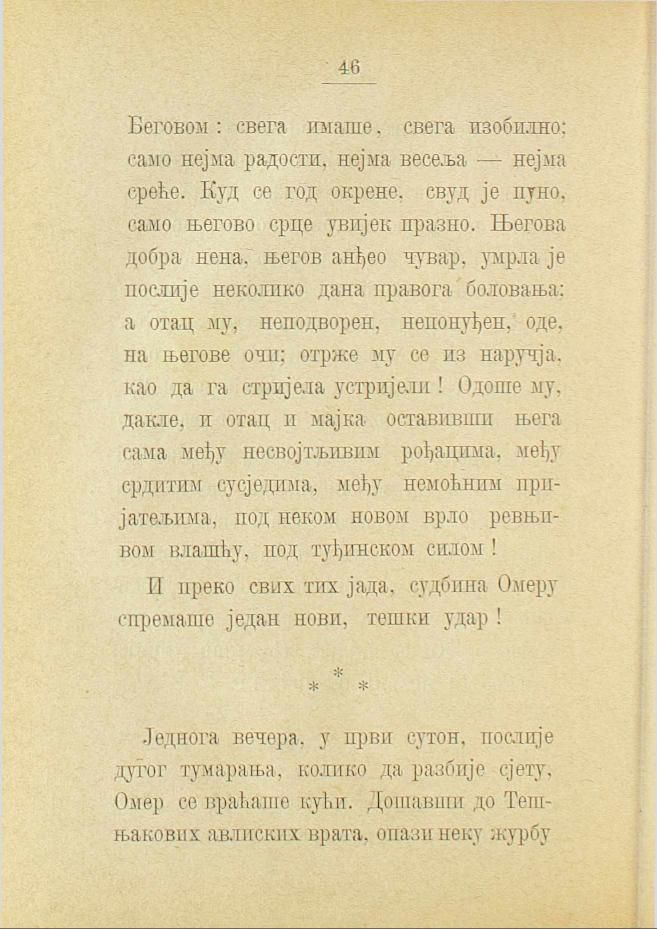 свега имаше, свега изобилно; само нејма радости, нејма весеља — нејма среће. Куд се год окрене, свуд је пуно, само његово срце увијек празно. Његова добра нена: његов анђео чувар, умрла је послије неколико дана правога боловања: а отац му, неподворен, непонуђен, оде, на његове очи; отрже му се из наручја, као да га стријела устријели! Одоше му, дакте, и отац и мајка оставивши њега сама међу несвојтљивим рођацима, међу срдитим сусједима, међу немоћним пријатељима, под неком новом врло ревњивом влашћу, под туђинском силом!