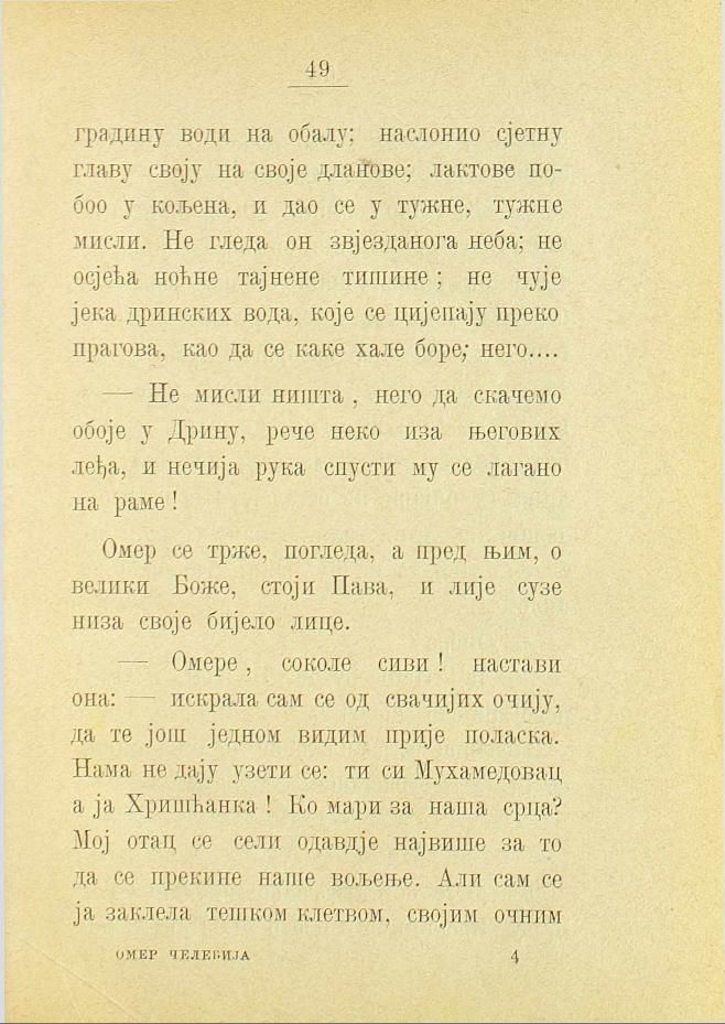 — Омере, соколе сиви! настави она: — искрала сам се од свачијих очију, да те још једном видим прије поласка. Нама не дају узети се: ти си Мухамедовац а ја Хришћанка! Ко мари за наша срца? Мој отац се сели одавдје највише за то да се прекине наше вољење. Али сам се ја заклела тешком клетвом, својим очним