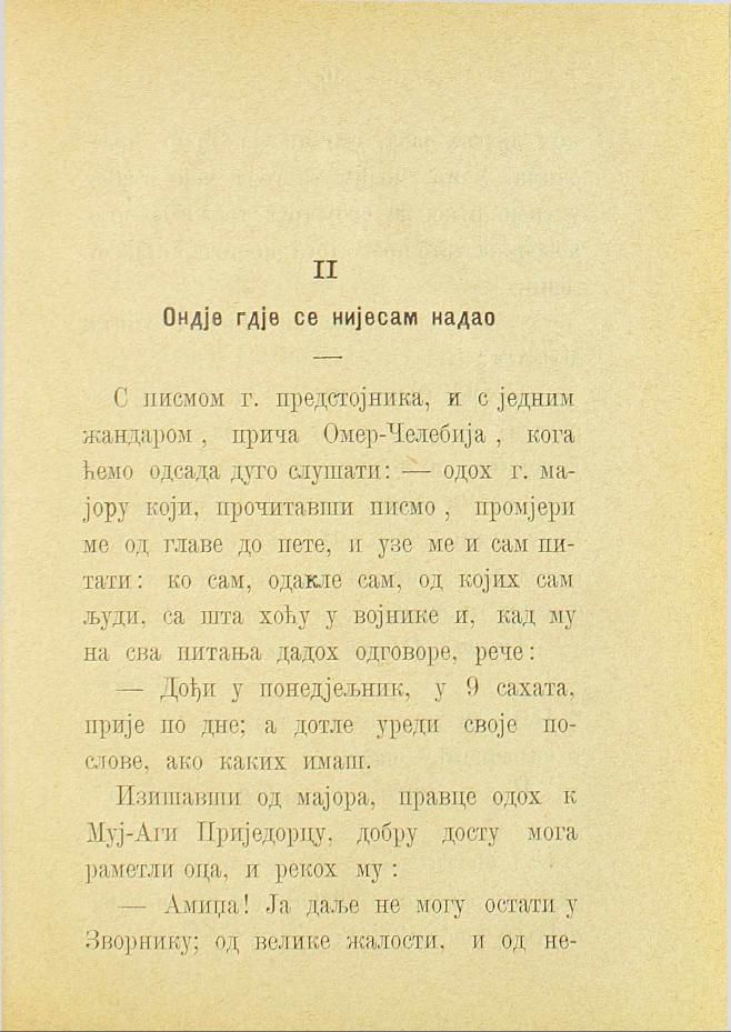 С писмом г. предстојника, и с једним жандаром, прича Омер-Челебија, кога ћемо одсада дуго слушати: — одох г. мајору који, прочитавши писмо, промјери ме од главе до пете, и узе ме и сам питати: ко сам, одакле сам, од којих сам људи, са шта хоћу у војнике и, кад му на сва питања дадох одговоре, рече: