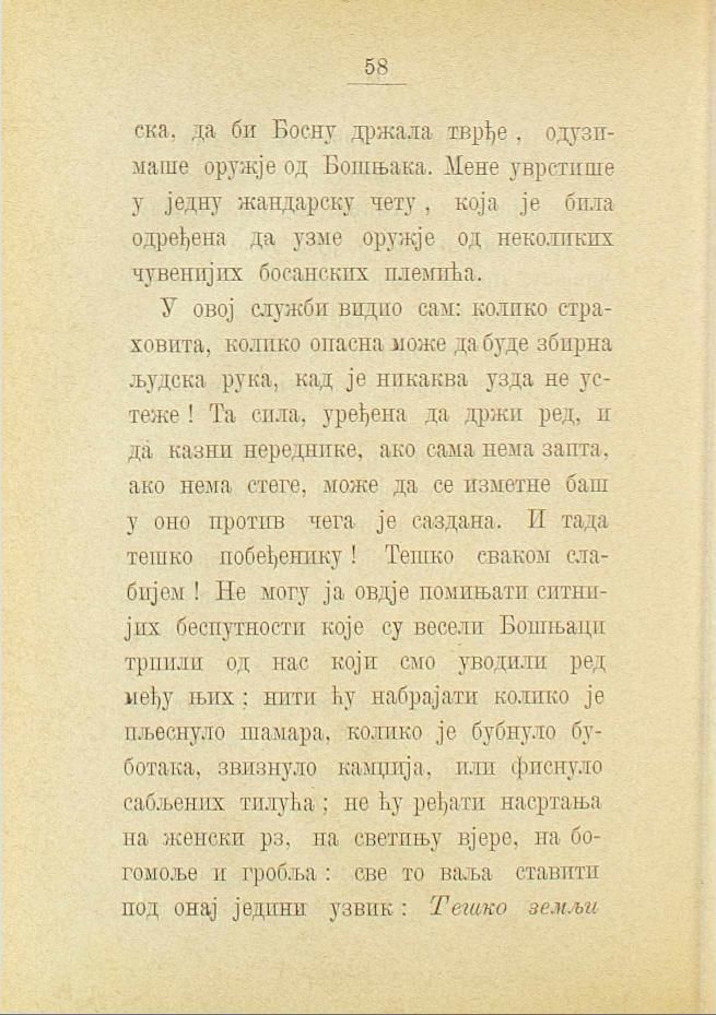 У овој служби видио сам: колико страховита, колико опасна може да буде збирна људска рука, кад је никаква узда не устеже! Та сила, уређена да држи ред, и да казни нереднике, ако сама нема запта, ако нема стеге, може да се изметне баш у оно против чега је саздана. И тада тешко побеђенику! Тешко сваком слабијем! Не могу ја овдје помињати ситнијих беспутности које су весели Бошњаци трпили од нас који смо уводили ред међу њих; нити ћу набрајати колико је пљеснуло шамара, колико је бубнуло буботака, звизнуло камџија, или фиснуло сабљених тилућа; не ћу ређати насртања на женски рз, на светињу вјере, на богомоље и гробља: све то ваља ставити под онај једини узвик: Тешко земљи