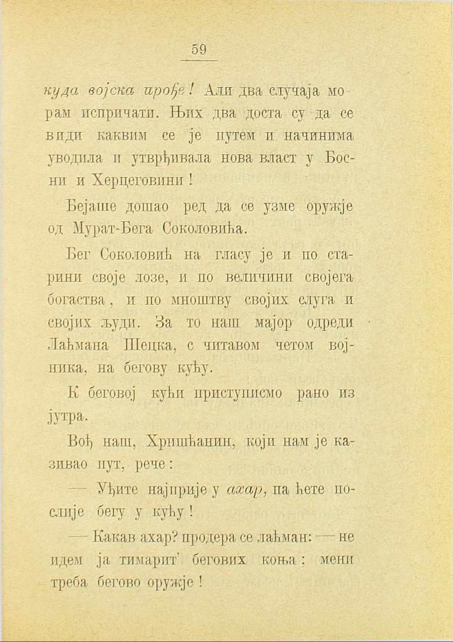 Бег Соколовић на гласу је и по старини своје лозе, и по величини својега богаства, и по мноштву својих слуга и својих људи. За то наш мајор одреди Лаћмана Шецка, с читавом четом војника, на бегову кућу.