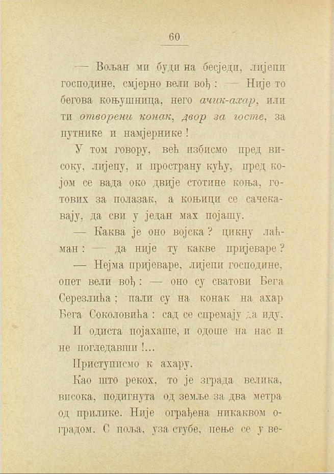 — Вољан ми буди на бесједи, лијепи господине, смјерно вели вођ: — Није то бегова коњушница, него ачик-ахар, или ти отворени конак, двор за госте, за путнике и намјернике!
