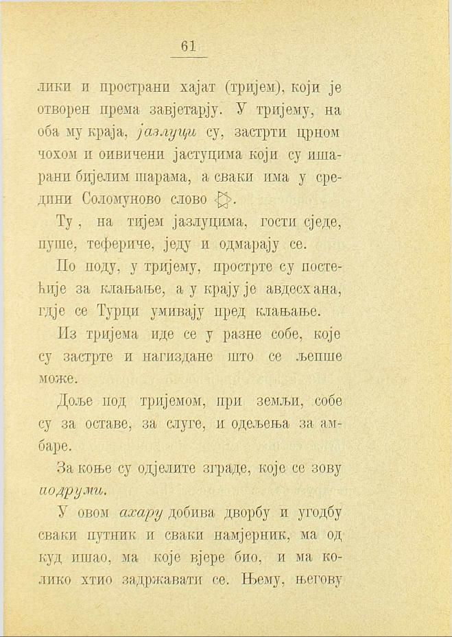 У овом ахару добива дворбу и угодбу сваки путник и сваки намјерник, ма од куд ишао, ма које вјере био, и ма колико хтио задржавати се. Њему, његову