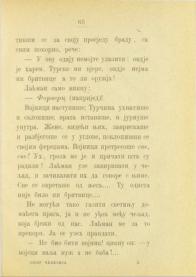 Војници наступише; Турчина ухватише и склонише; врата иставише, и јурнуше унутра. Жене, видећи њих, заврискаше и разбјегоше се у углове, поклопивши се својим фереџама. Војници претресоше све, све! Ух, гроза ме је и причати шта су радили! Лаћман узе завиривати у чељад, и зачикавати их да говоре с њиме. Све се окреташе од њега. Ту одиста није било ни бритвице....