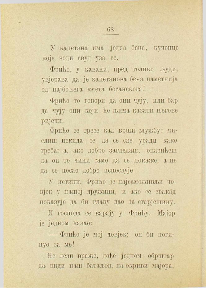 Фрићо се тресе кад врши службу: мислиш искида се да се све уради како треба: а, ако добро загледаш, опазићеш да он то чини само да се покаже, а не да се посао добро испослује.