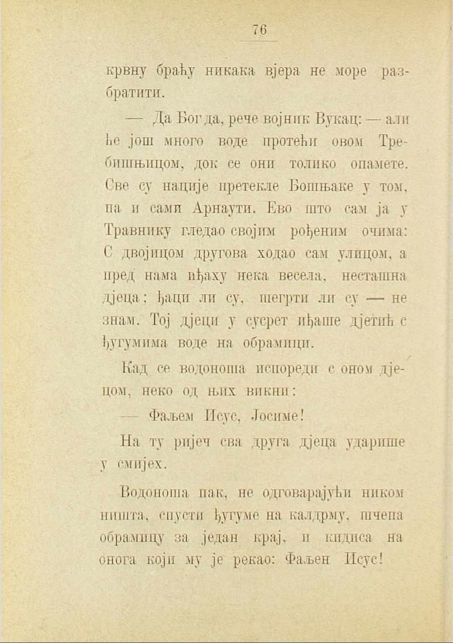 — Да Бог да, рече војник Вукац: — али ће још много воде протећи овом Требишњицом, док се они толико опамете. Све су нације претекле Бошњаке у том., па и сами Арнаути. Ево што сам ја у Травнику гледао својим рођеним очима: С двојицом другова ходао сам улицом, а пред нама иђаху нека весела, несташна дјеца: ђаци ли су, шегрти ли су — не знам. Тој дјеци у сусрет иђаше дјетић с ђугумима воде на обрамици.