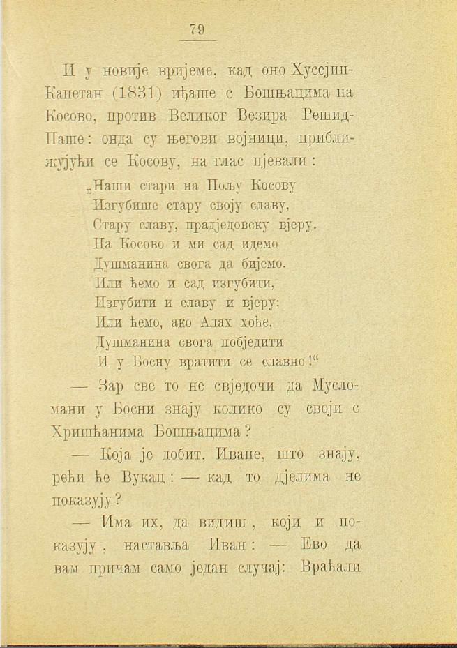 И у новије вријеме, кад оно Хусејин-Капетан (1831) иђаше с Бошњацима на Косово, против Великог Везира Решид-Паше: онда су његови војници, приближујући се Косову, на глас пјевали: