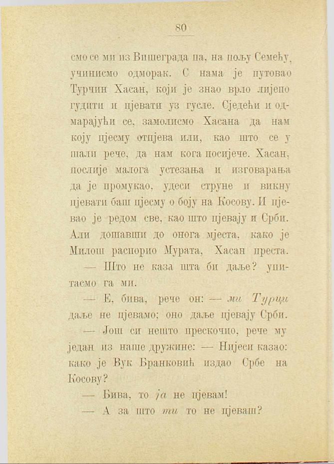 смо се ми из Вишеграда па, на пољу Семећу, учинисмо одморак. С нама је путовао Турчин Хасан, који је знао врло лијепо гудити и пјевати уз гусле. Сједећи и одмарајући се, замолисмо Хасана да нам коју пјесму отпјева или, као што се у шали рече, да нам кога посијече. Хасан, послије малога устезања и изговарања да је промукао, удеси струне и викну пјевати баш пјесму о боју на Косову. И пјевао је редом све, као што пјевају и Срби. Али дошавши до онога мјеста, како је Милош распорио Мурата, Хасан преста.