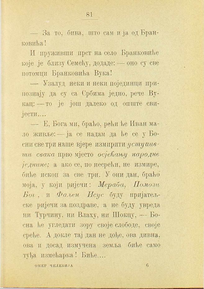 — Е, Бога ми, браћо, рећи ће Иван мало живље: — ја се надам да ће се у Босни све три наше вјере измирити уступивши свака прво мјесто осјећању народне једнине; а ако се, по несрећи, не измире, биће ископ за све три. У они дан, браћо моја, у који ријечи: Мераба, Помоз Бог и Фаљен Исус буду пријатељске ријечи за поздраве, а не буду увреда ни Турчину, ни Влаху, ни Шокцу, — Босна ће угледати зору своје слободе, своје среће. А докле тај дан не дође, ова дивна, ова и досад измучена земља биће само туђа измећарка! Биће....